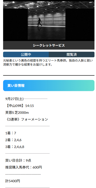 夏競馬でかなり勝たせてもらったのでワンランク上のシークレットサービスに参加したんですけど中9レースの芙蓉ステークスの3万馬券当たりました!